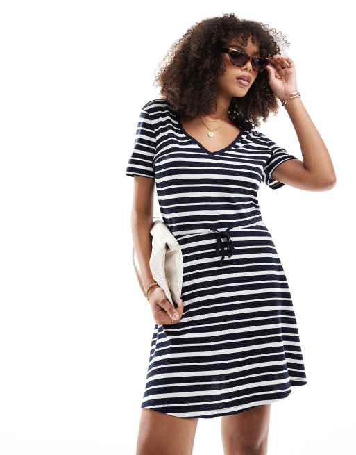 Only Gestreepte mini jurk met V hals en gestrikte taille in wit en marineblauw Very well made.