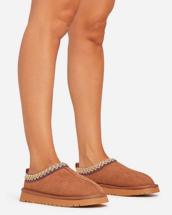 Catch Up Aztec Detail Faux Fur Lining Flat Slipper In Chestnut Brown Faux Suede EGO Very well made.