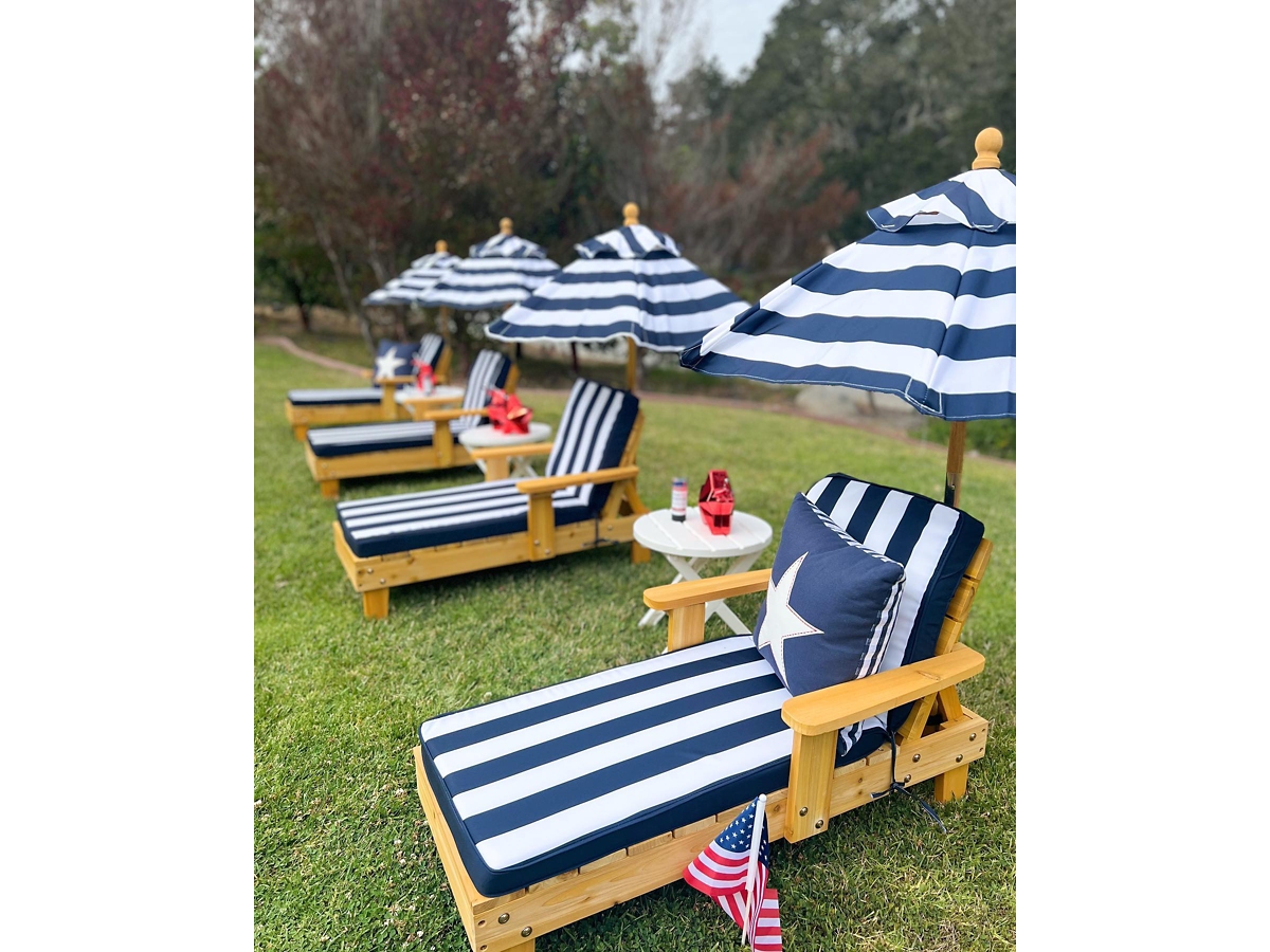 Kidkraft outdoor table and chair set hot sale with cushions and navy stripes Very well made.