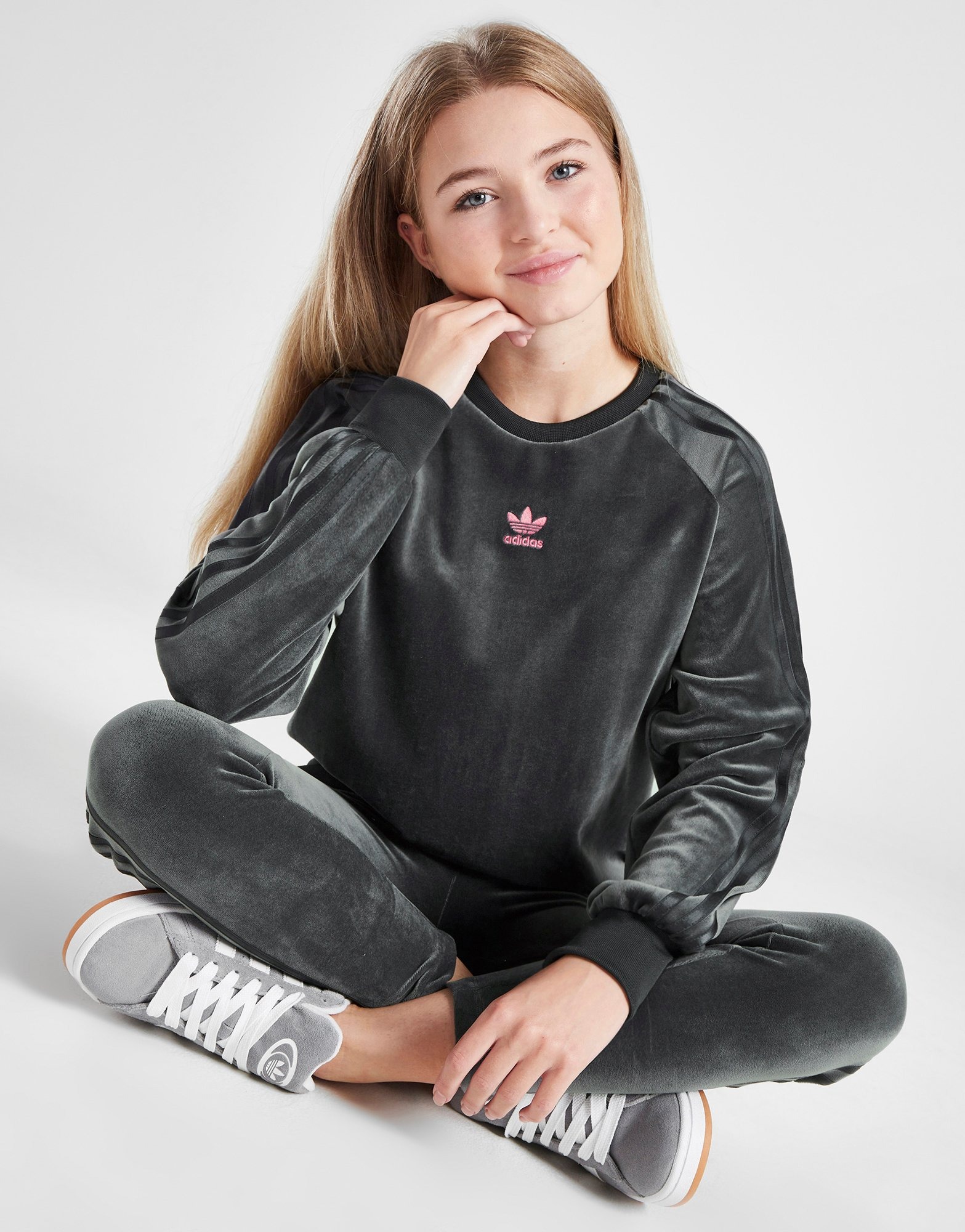Grey adidas Originals Girls Velour Crew Sweatshirt Junior JD Sports Malaysia Very well made.