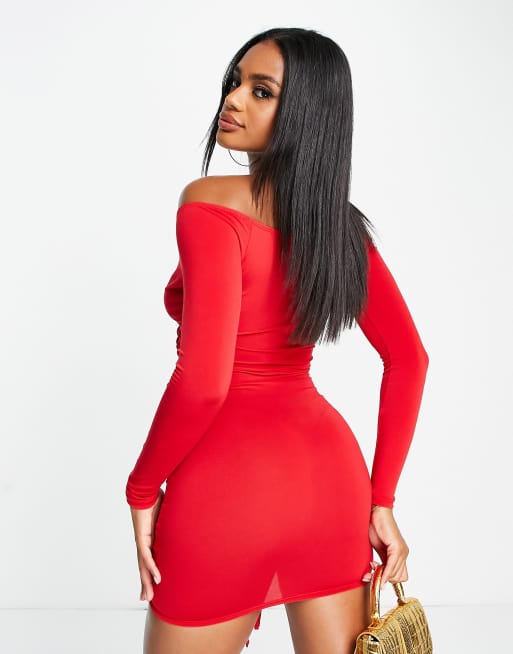 Flounce London Robe courte moulante a fronces et encolure Bardot Rouge ASOS Very well made.