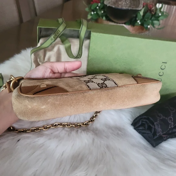 100 Authentic Gucci vintage mini tan suede Monogram Pochette Nailhead bag Bags Very well made.